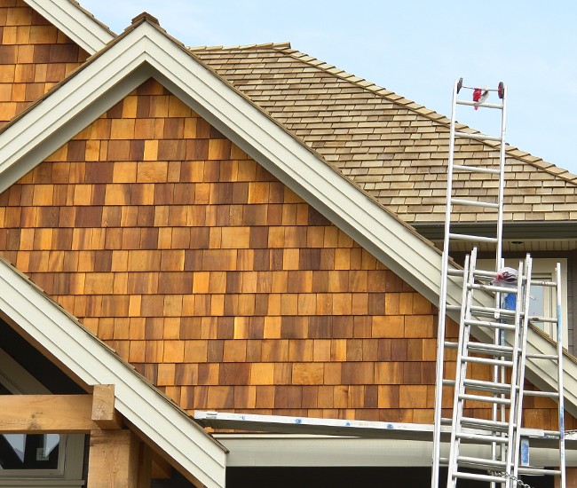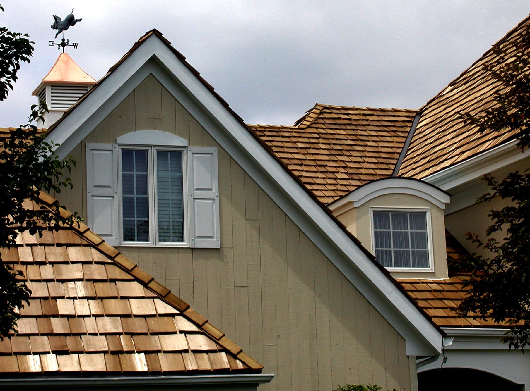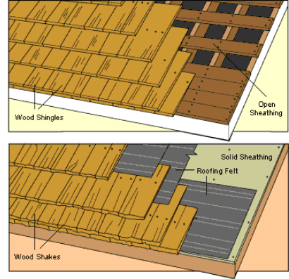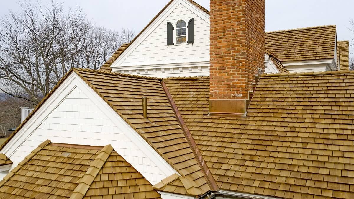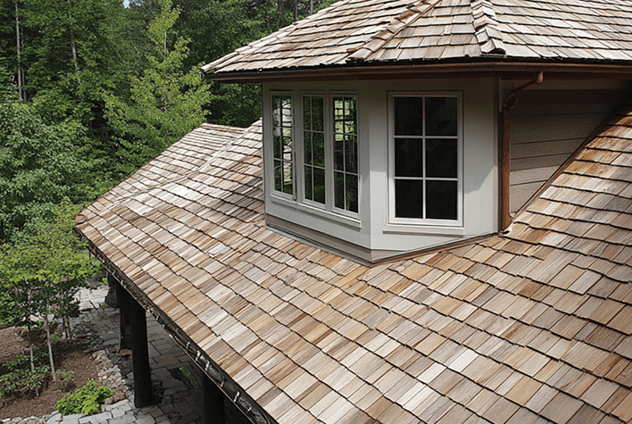 Cedar shake roofing uses natural wood shingles installed in overlapping layers over a waterproof base.